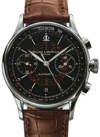 Stainless steel case, Brown alligator strap with buckle, Black dial stick hour markers, Tachometer and telemeter scales, Displays date at 6.