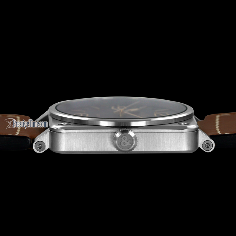 • Beige/brown calfskin leather strap with a partial "hot stamping" of the Bell & Ross logo at the buckle end.