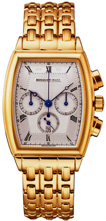 Tonneau Shaped Watch with a Slightly Curved Case. Features a chronograph/stop-watch function. Beautiful Hand Engraved (engine-turned) Silver Dial. Roman Numeral Hour Markers. Blue "Breguet" Style Hands, Date window displayed at the 6 o'clock position. 45 Hour Power Reserve.