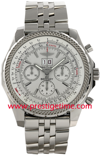 This distinctive model with it's criss-crossed engraved bezel is worthy of its affiliation with the Bentley name. Silver Dial with Silver toned/Luminous Hands & index Hour Markers. Other Features: Chronograph/Stop watch functions. Fitted with the "Slide Rule" aka "Navigation Computer" which allows to compute different airborne calculations such as fuel consumption, climbing times & converting miles into nautical miles or kilomters. Double Window Large Date Displayed directly beneath the 12 o'clock position. Special Decorated Case-back has been Stamped/Embossed with the distinct shape & outline of a Bentley Rim.