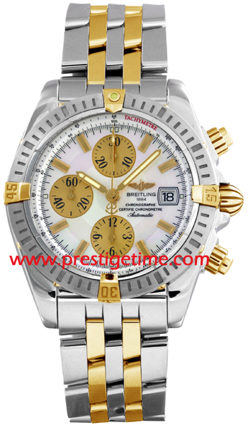 White Mother of Pearl Dial with Gold/Champagne colored Sub-Dials. Gold-Tone Index hour markers & hands. This watch Features: 1/4th of a second Chronograph & a Tachymeter Scale. Date Displayed at the 3 o'clock position.