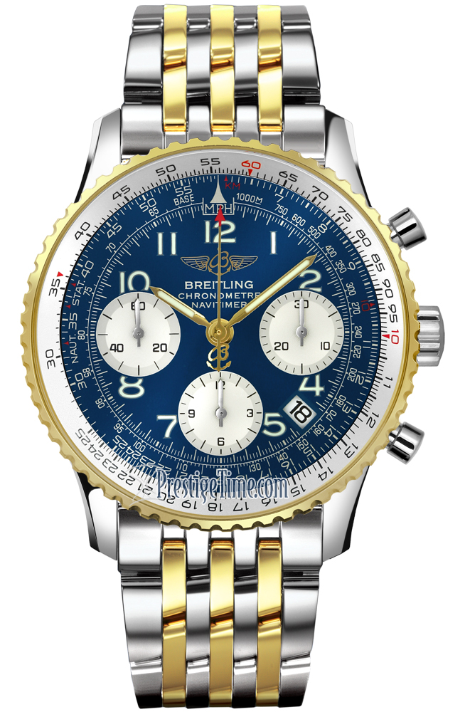 The original Navitimer watch. 18KT Yellow gold and Stainless Steel Case & Bracelet , Luminous ARABIC Numeral hour markers & Hands. Blue Dial with Silver Sub-Dials. This watch Features: 1/4th of a second Chronograph. Fitted with the "Slide Rule" aka "Navigation Computer" which allows to compute different airborne calculations such as fuel consumption, climbing times & converting miles into nautical miles or kilomters. Date Displayed between the 4 & 5 o'clock position.
