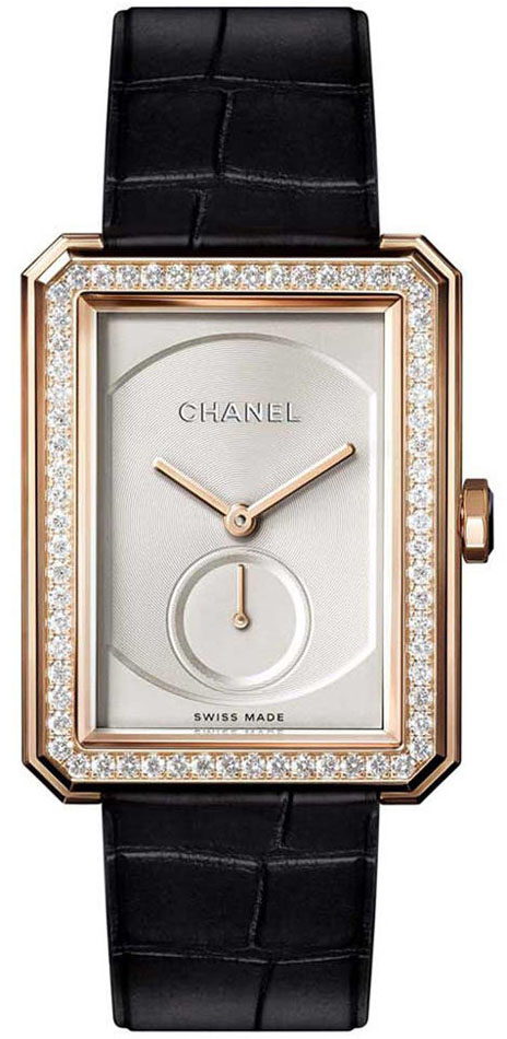 • Black alligator leather strap with gold buckle set with 48 diamonds.