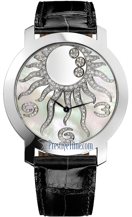 • Natural mother of pearl dial with diamonds set in white gold inlay a sun-ray design pattern seemingly emanating from "sun" - the circular cut-out encasing the 3 floating diamonds.