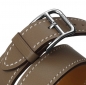 • Taupe calfskin leather "double tour" strap with contrasting white stitching and a tang buckle. The strap winds around the wrist two times.