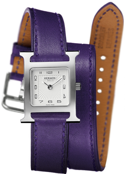 • Smooth iris (purple) calfskin leather "double tour" strap which winds around the wrist two times.