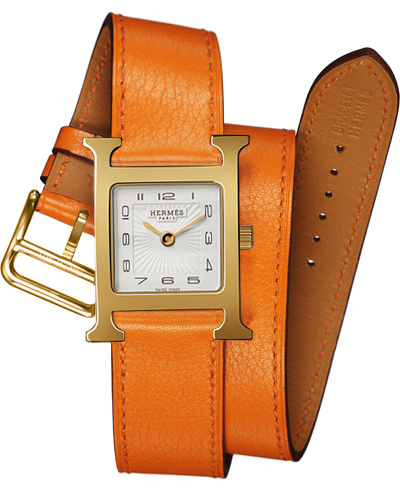 • Smooth orange calfskin leather "double tour" strap which winds around the wrist two times.