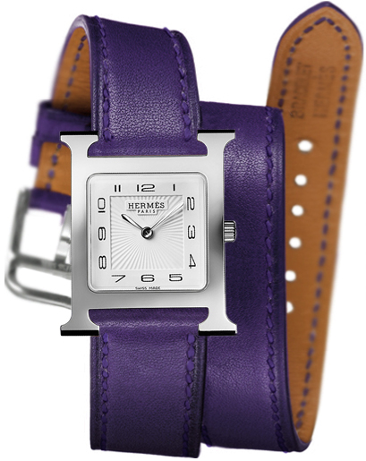 • Smooth iris (purple) calfskin leather "double tour" strap which winds around the wrist two times.