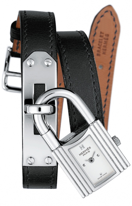 • Black barenia calfskin leather "double tour" strap which winds around the wrist two times.