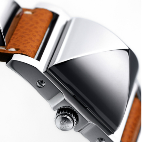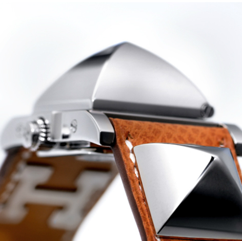 • Strap features steel studs, and the dial is covered by a stud-shaped compartment, both of which contribute to a design that pays tribute to a hunting dog collar. The compartment is opened by pressing on the crown.