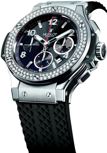 Stainless Steel Case with a brushed finsh, Diamond Set Steel Bezel, center (edge) lateral black Kevlar inserts. Crown & Chronograph buttons have rubber centers/inserts that match the black Kevlar. Jet black dial with brushed steel "appliqué" applied Hour Markers. Immediately recognizable "H" style screws on bezel. Approximately 42 hour power reserve.