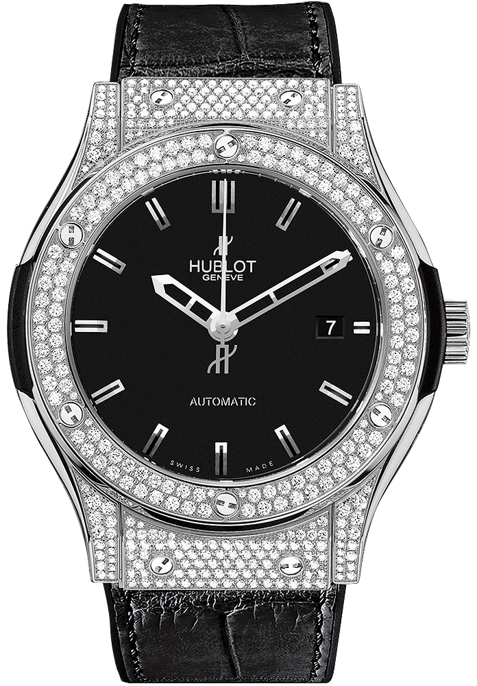 • Polished titanium case: entire case top pave set with 228 brilliant cut diamonds weighing a total of approximately 1.22 carats