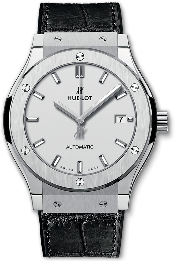 • Polished titanium crown engraved with the Hublot logo.
