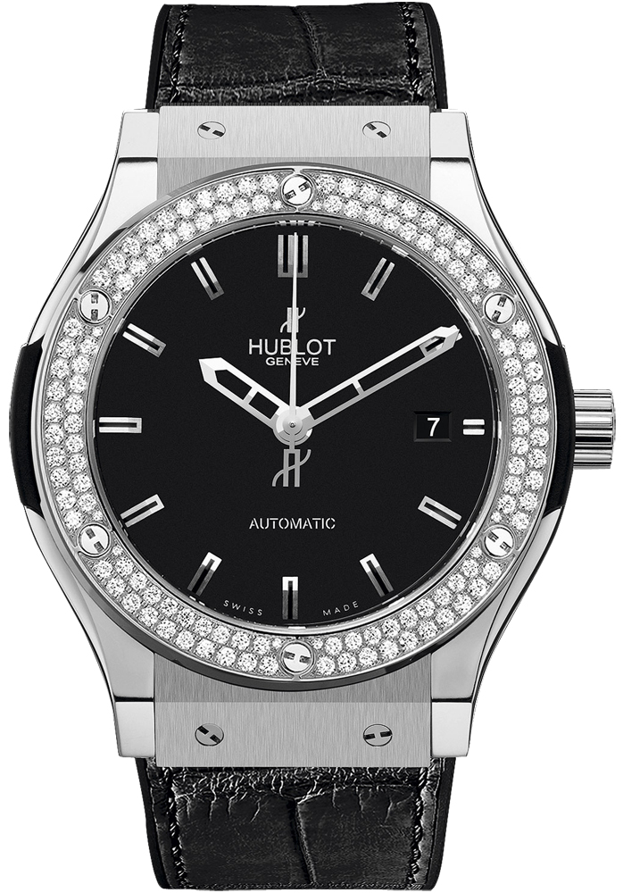 • Polished titanium crown engraved with the Hublot logo.
