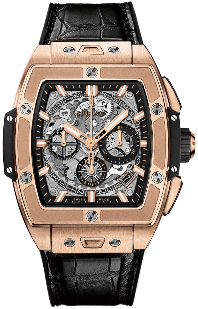 Case: 18kt rose gold - brushed & polished, 18kt king gold. black composite resin bezel base & case sides.
