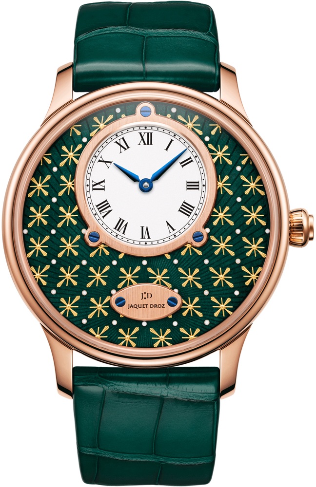 The art of "PAILLONNEE": "PAILLON" in French translates to "thin leaf of metal", the art of creating these gold ornaments has long been lost, however Jaquet Droz uses paillons produced decades ago.  Paillon Decorating is a delicate & complicated art, comprised of applying these delicate ornaments to an enamel based dial & then coating the entire dial with a semi-translucent enamel coating. The procedure requires baking the enamel dial at least 10 times in temperatures over 800 degrees Celsius.