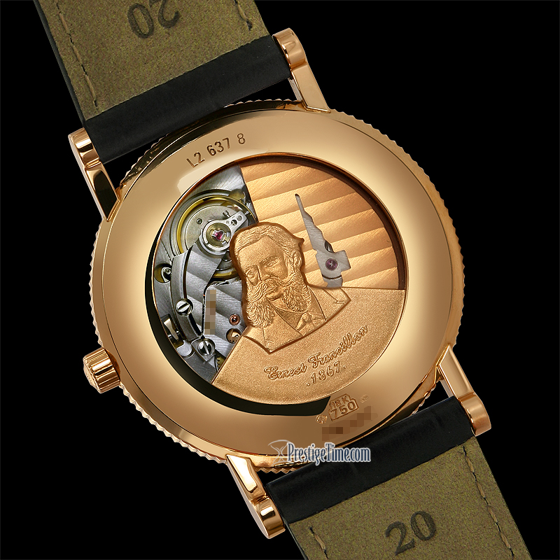 • A raised solid Rose Gold bust of Mr. Ernest Francillon adorns the case back (above the sapphire crystal display case back.