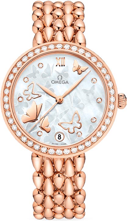 • White mother of pearl dial decorated with a beautiful and unique butterfly pattern