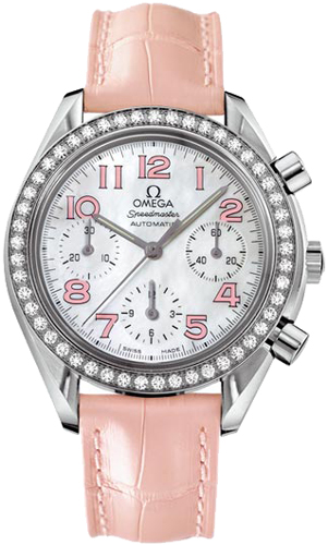 Stainless Steel Case with Pink Leather Strap, White Mother of Pearl Dial with Pink Arabic numerals, Diamond set Bezel, Chronograph Functions, Luminous Hands, Power Reserve of 40 Hours.