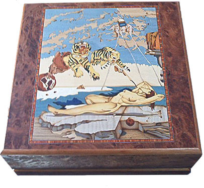 For over 70 years the Italian company Giglio Asla have supplied the highest quality in inlaid wood all over the world.  Especially for our Artisan series, they have designed cases both exceptional in quality and appearance which are detailed with intarsia of the classic Salvador Dali work of art known as Danae. Intarsia designs are created with hundreds of tiny pieces of wood, carefully selected, to make each item one of unique beauty and craftsmanship.  The particular variety of woods, originating for the most part from Europe and Africa, the drying process, the assembly and varnish processes, all contribute towards the making of exceptional cases. The meticulous puzzle-like assembly of tiny pieces of wood may require up to 25 different wood varieties. Giglio's woods are perfectly dried and the veneering is meticulously selected. The woods comprise ebony, elmwood, maple, poplar, briar, rosewood, vavon and walnut dyed in different colors.