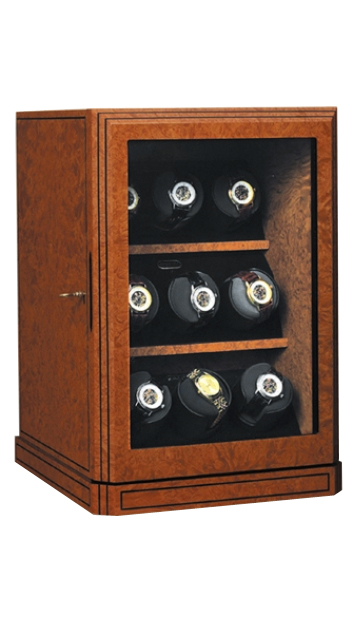 A great way to wind and display your watch collection! Finished in a durable Madrona Burl vaneer and also available in Mahogany Parquet or Brazilian Rosewood. Designed to independently wind up to nine automatic watches. May be operated on batteries or with supplied AC/DC adapter.