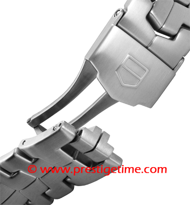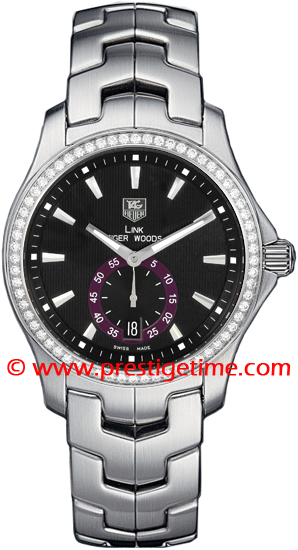 Brushed Stainless steel case and bracelet, Bezel set with 64 diamonds (aprox. 0.91 carats), Black dial with vertical pinstripes, Luminous hands and hour markers, Oversized burgundy seconds subdial, Date displayed at 6, Sapphire crystal caseback with Tiger Woods signature.