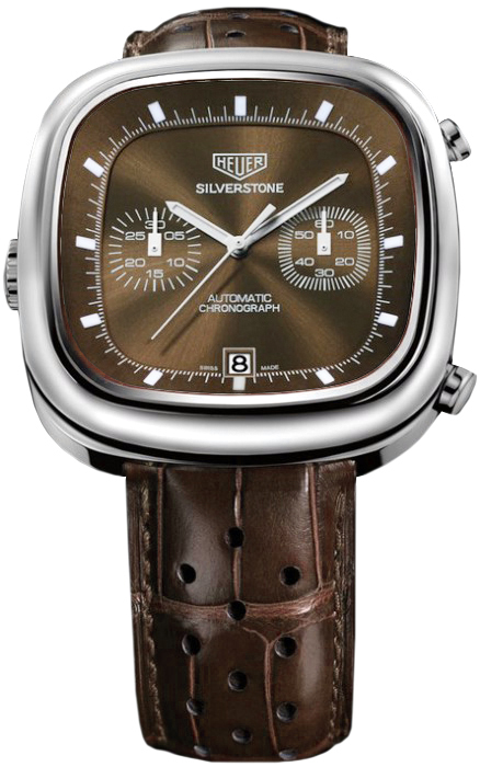 Celebrating the 150th anniversary of TAG Heuer is a re-issue of the original 1974 Silverstone.  The original Silverstone models were named after the 'Silverstone Race Circuit' a famed English racing track. In keeping with the design, the 2010 edition features the "cushioned" square shaped case with rounded edges and the vintage HEUER logo on the dial. This watch is fitted with a modern version of famous Calibre 11 movement, immediately recognizable by the crown of the left side. The calibre 11 movement was the first square chronograph movement.
