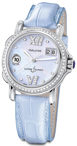 Light blue leather strap, Light blue Mother of Pearl dial with eight diamond hour markers and diamond set Arabic numerals, Bezel set with one row of diamonds(approx. 0.80 carats), Second time zone with quick setting, Big date display, Large second hand, Automatic movement with power reserve about 42 hours.