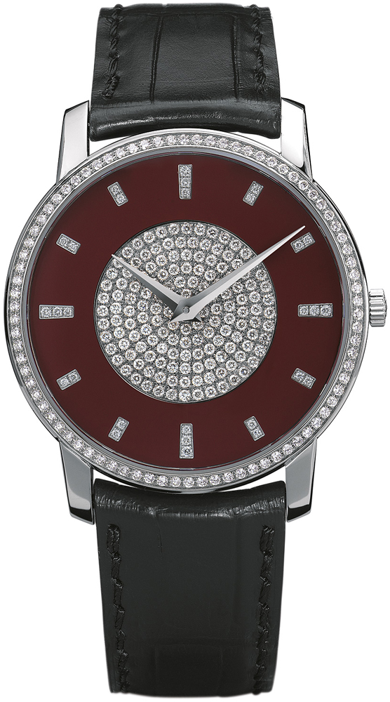 • Wine Red lacquered dial with diamond set index hour markers. Center of dial pave set with diamonds.