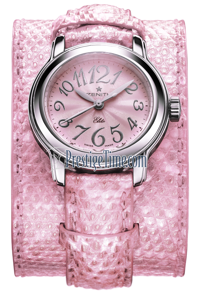 Light pink Guilloche Dial, Bold Silver Toned Arabic Numeral Hour Markers, Sapphire case back with engraved Zenith stars, Pink lizard strap and cuff lined with silky Alzavel calfskin. Power Reserve about 50 hours.