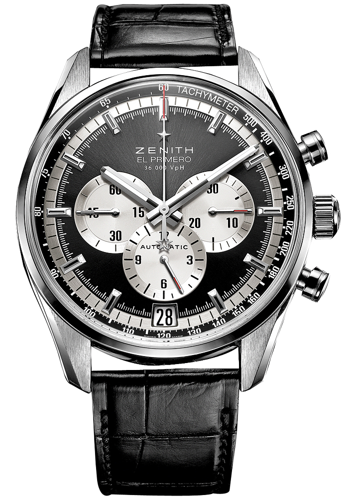 • Large silver and red central seconds counter hand (with the Zenith star logo as a counterweight).