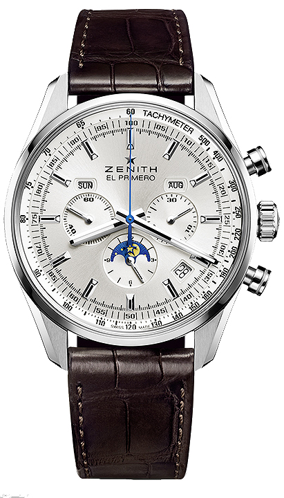 • Large blued steel central seconds counter hand (with the Zenith star logo as a counterweight).