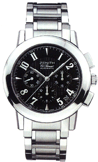 Stainless Steel Case & Bracelet, Black Guilloche Dial, Bold White Arabic Numeral Hour Markers. The Famous El Primero Automatic Chronograph Movement, date displayed between 4 & 5 o'clock position, Stop-Watch Functions.