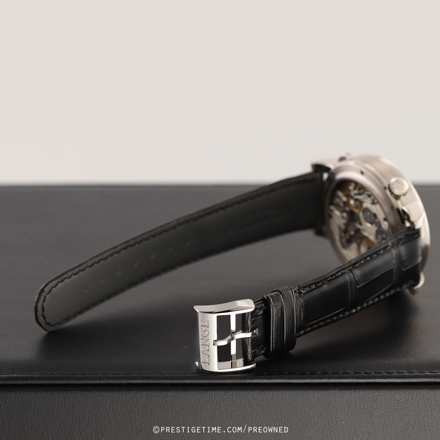 Strap: Fitted a brand new A. Lange & Sohne original black alligator leather strap with a solid 18kt white gold tang buckle. The strap is brand new, in unworn condition with its full wear lifespan remaining.
