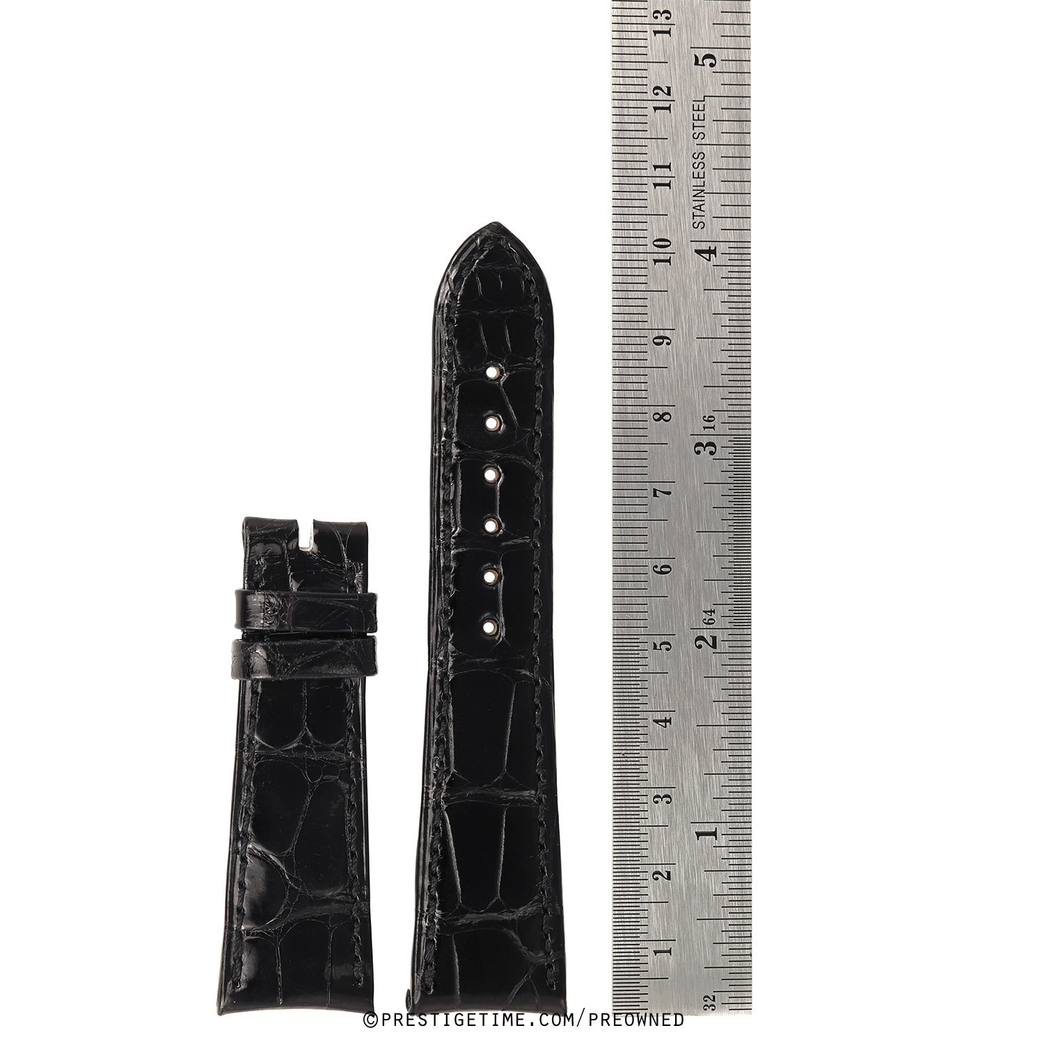 Genuine Audemars Piguet black glossy alligator leather strap with curved ends.