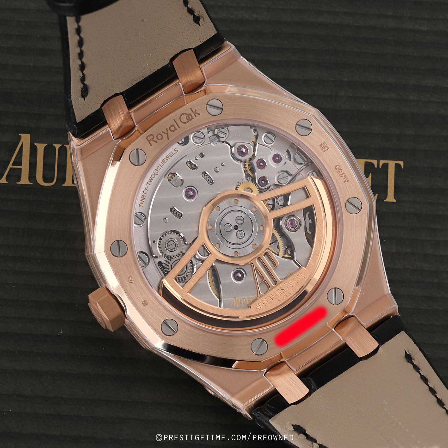 Movement: Powered by an in-house AP caliber 4302, which beats at 28,800 vph (4Hz), composed of 257 components, with 32 jewels & has a power reserve of +/- 70 hours. The movement features a solid rose gold oscillating rotor with a skeletonized AP logo monogram.