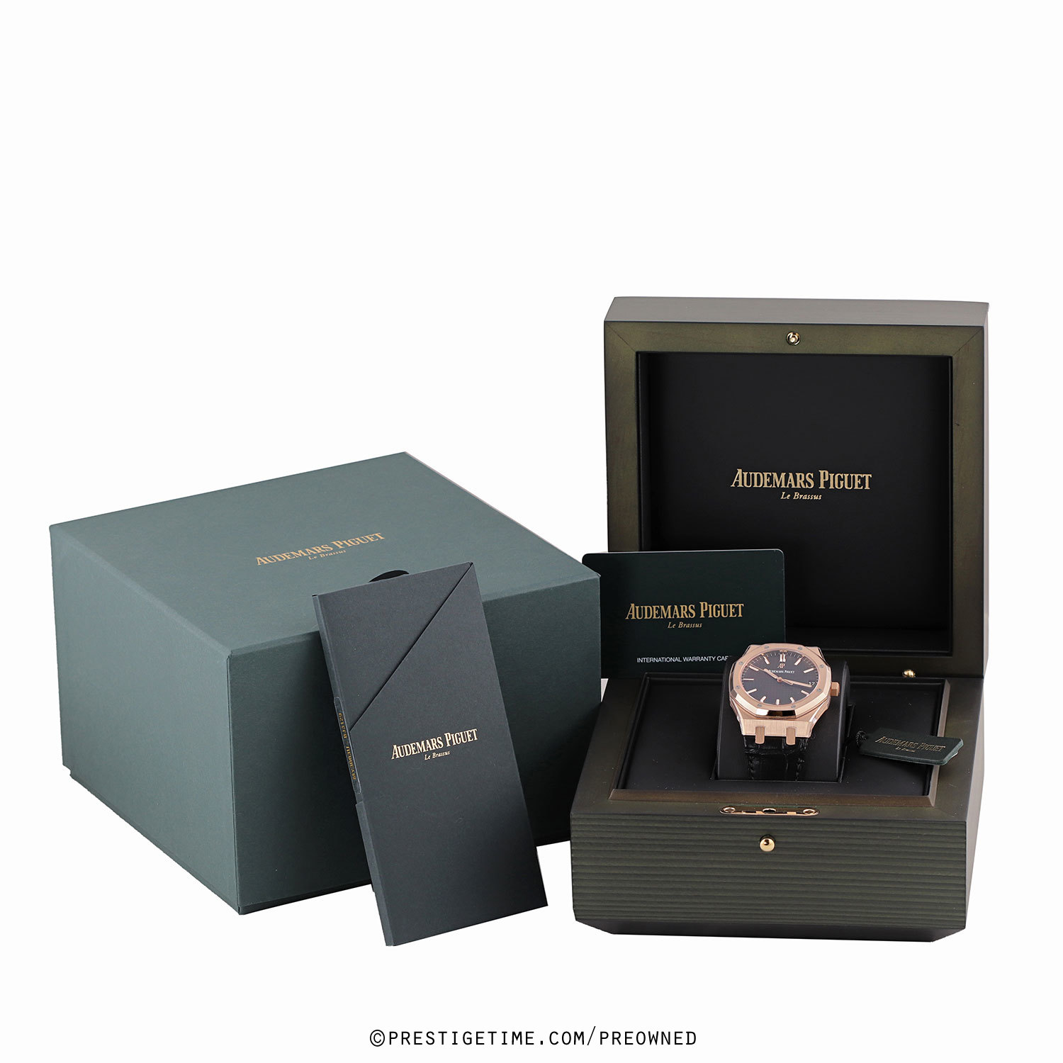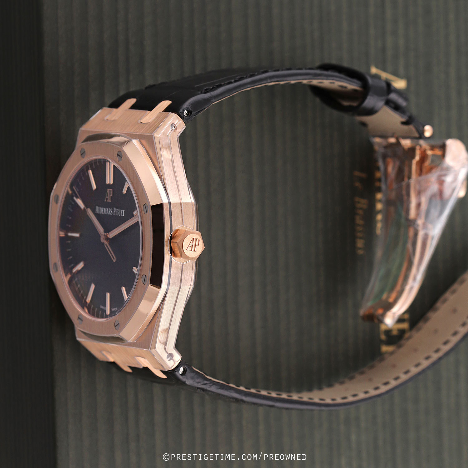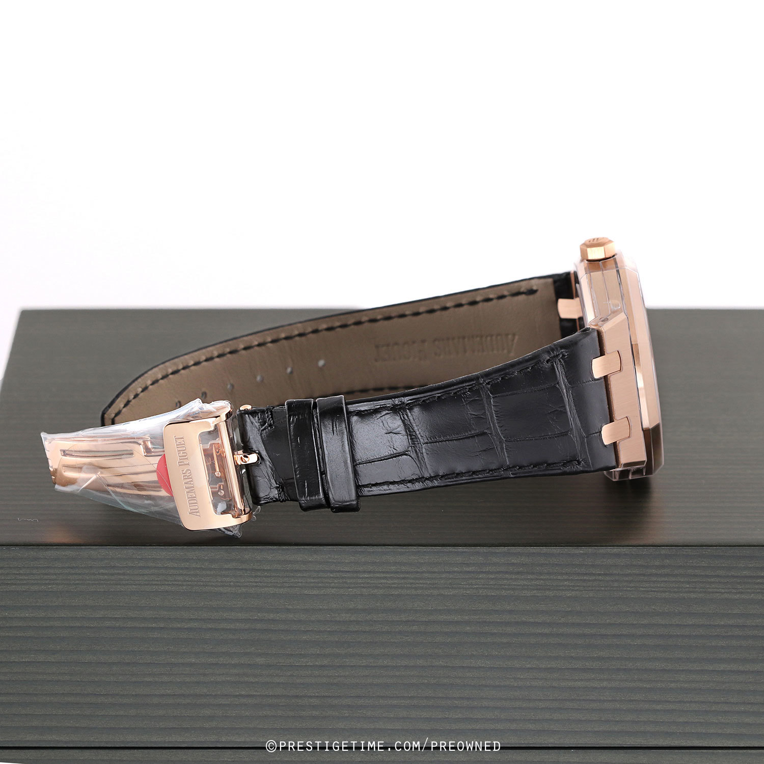 Strap: Fitted on its AP original black alligator leather strap with a solid 18kt rose gold deployant buckle. The strap is brand new & unworn.