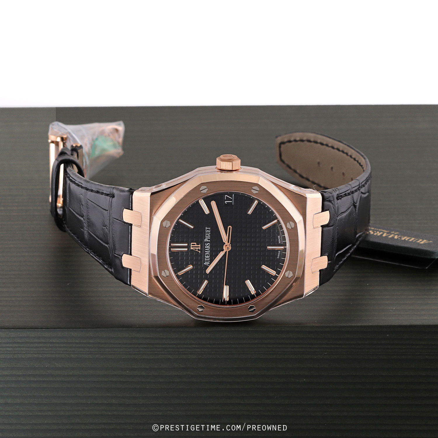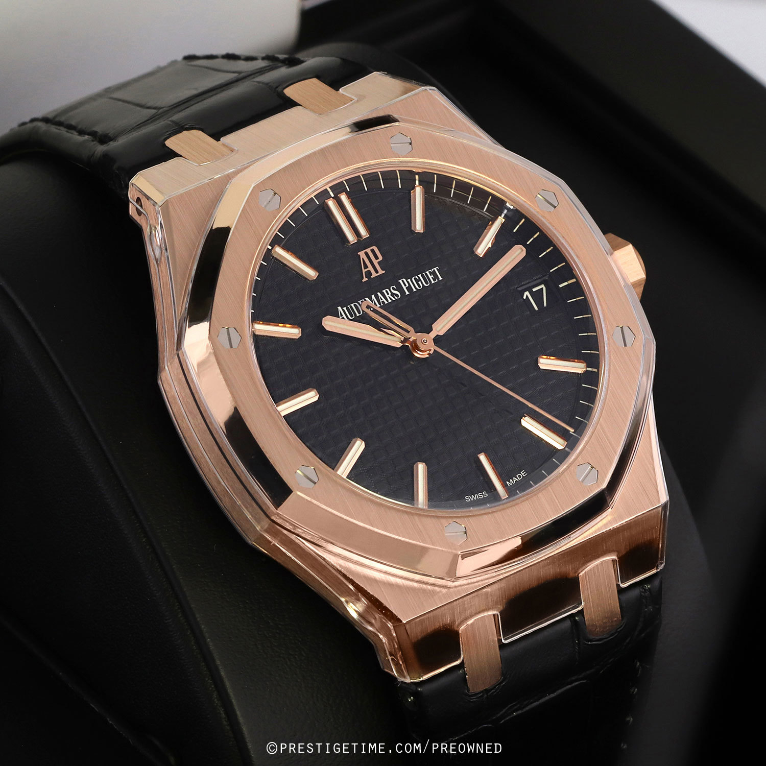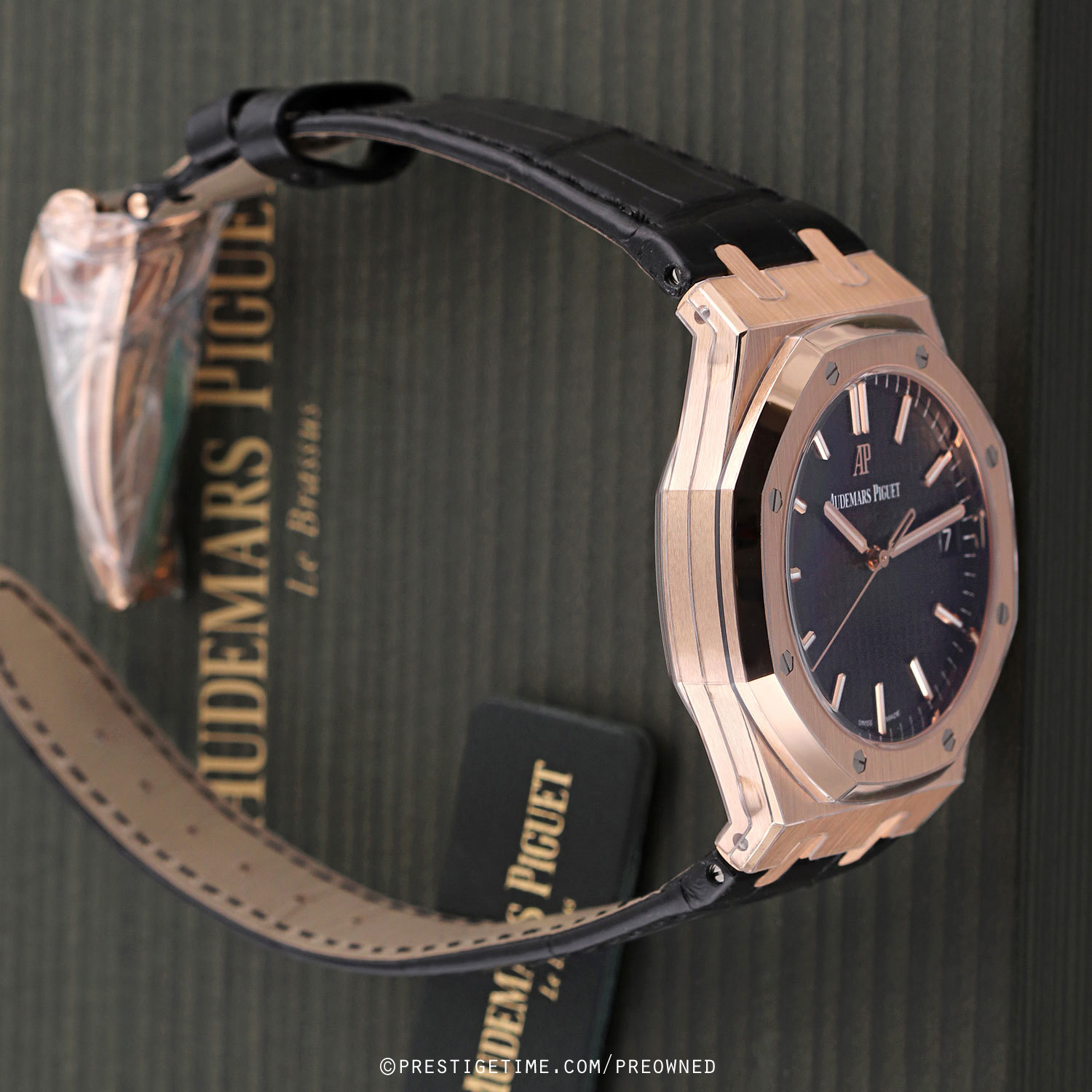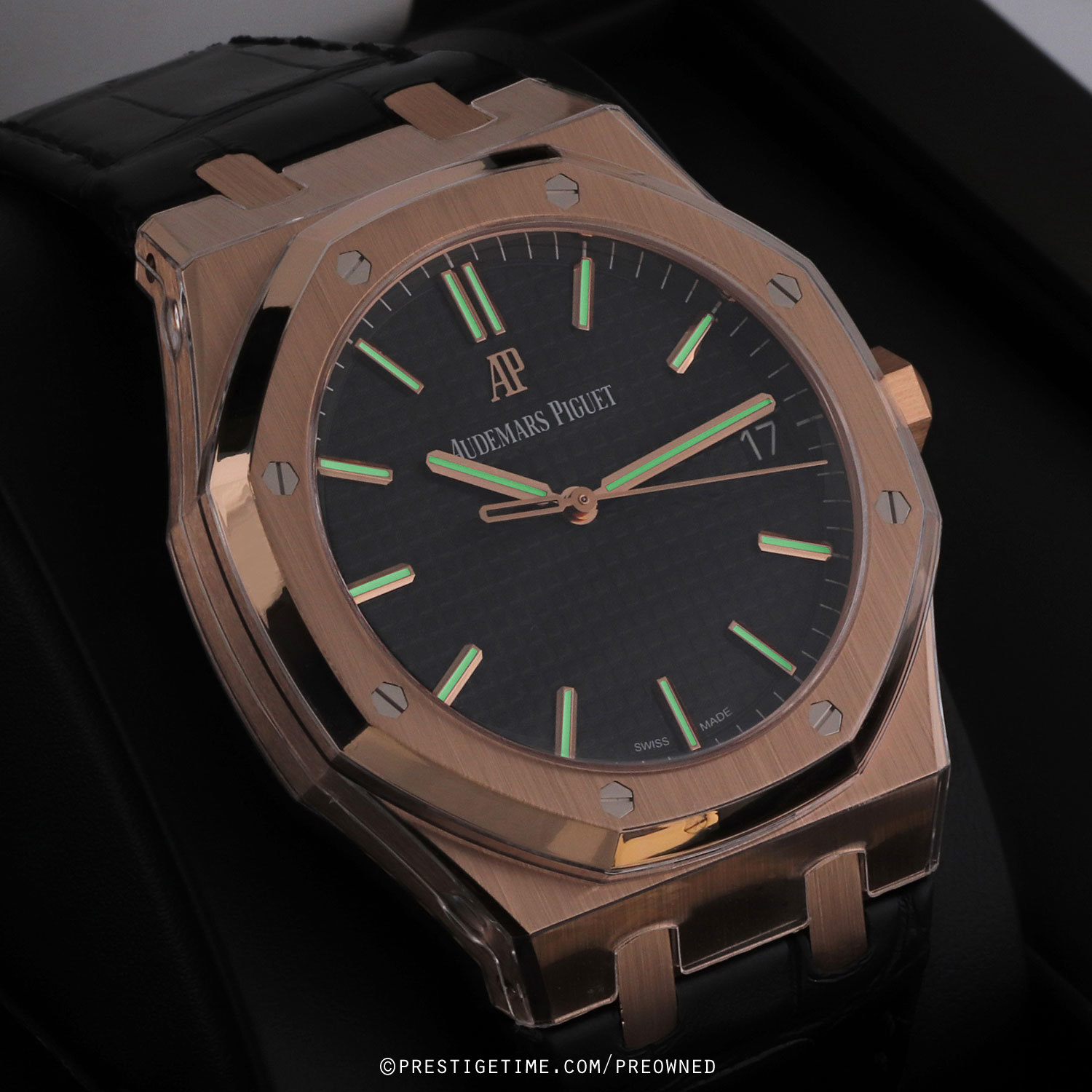 Case: Brushed & polished 18kt rose gold case. Brushed & polished 18kt rose gold bezel secured by 8 polished white gold hex-head screws. Black dial with the AP's signature grande tapisserie design pattern. Rose gold hands, the hour & minute hands with luminous fill. Applied rose gold index hour markers with luminous fill. Fine printed minutes/seconds track on the dial flange. Date window at  3 o'clock.