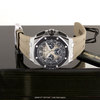 Case: Brushed stainless steel case with polished beveled corners. Brushed & polished black ceramic bezel secured by 8 polished hex-head screws. Black ceramic crown & chrono buttons. Sandblasted stainless steel crown & button guards. Smoked graduating light brown to dark brown (brown-grey tinge) main dial with the Mega Tapisserie pattern design. Black sub-dials & dial rim. Black dial flange with Tachymeter scale. Polished white gold central hands, the hour & minute hands with luminous fill. Applied polished white gold index hour markers with luminous fill. Fine printed minutes/seconds & fractions of a seconds track. Small seconds sub-dial at 6 o'clock. Date window at 4.30.
