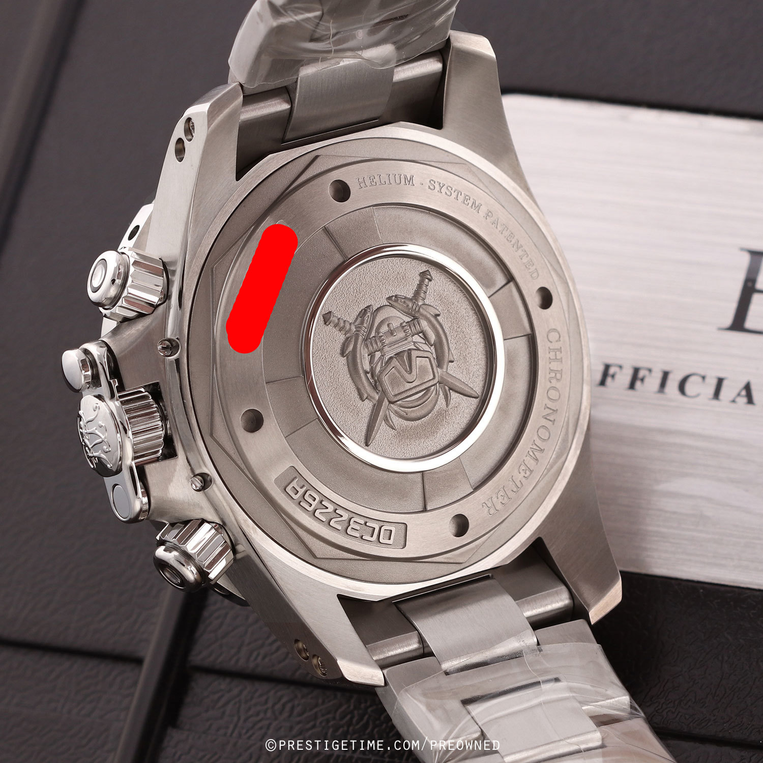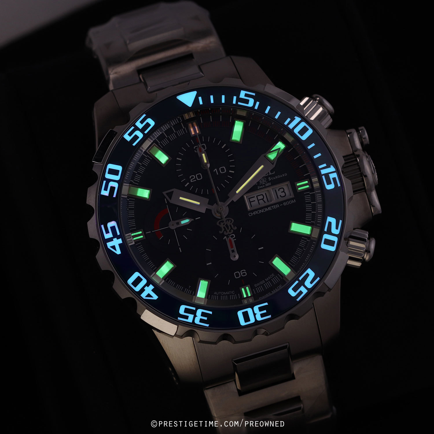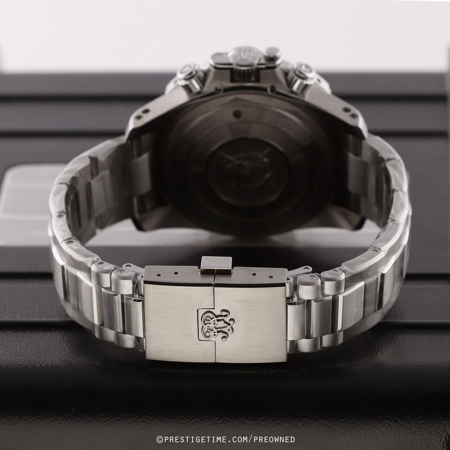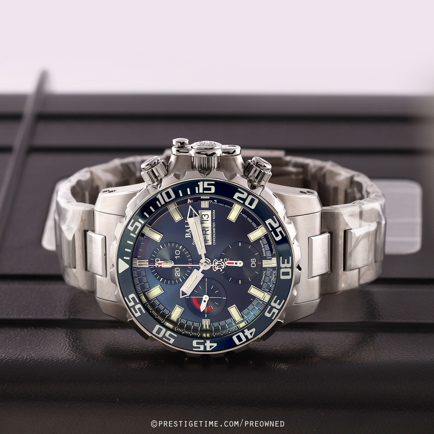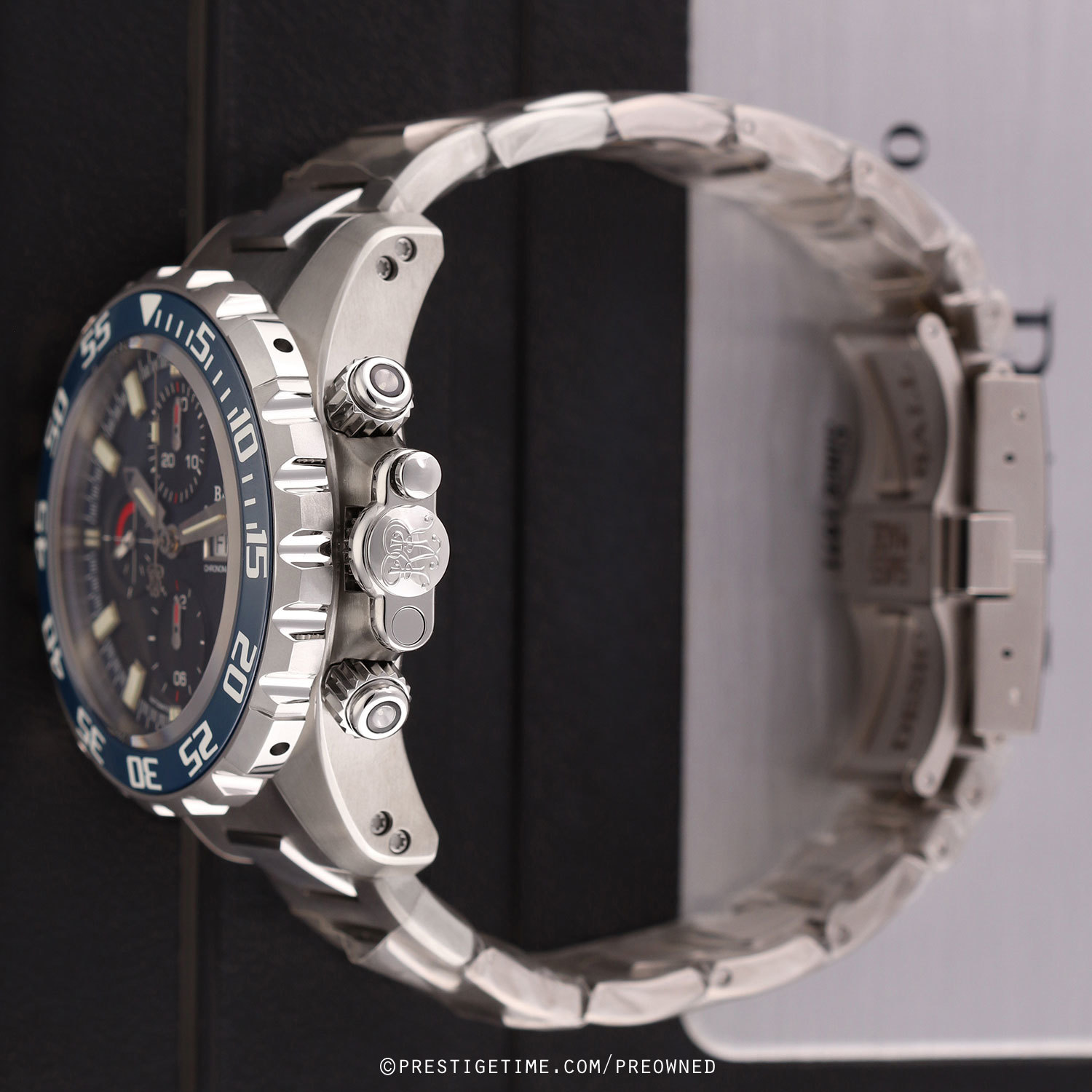 Case: Brushed & polished titanium case. Patented crown protector with push-button swivel bar. Helium escape valve. Uni-directional rotating bezel with a polished blue ceramic bezel ring featuring a 60 minute diving scale. Graduated blue dial. Polished hands. Applied index hour markers. Fine printed minutes/seconds & fractions of a seconds tracks. Day & date windows at 3 o'clock. Small seconds sub-dial at 9 o'clock.