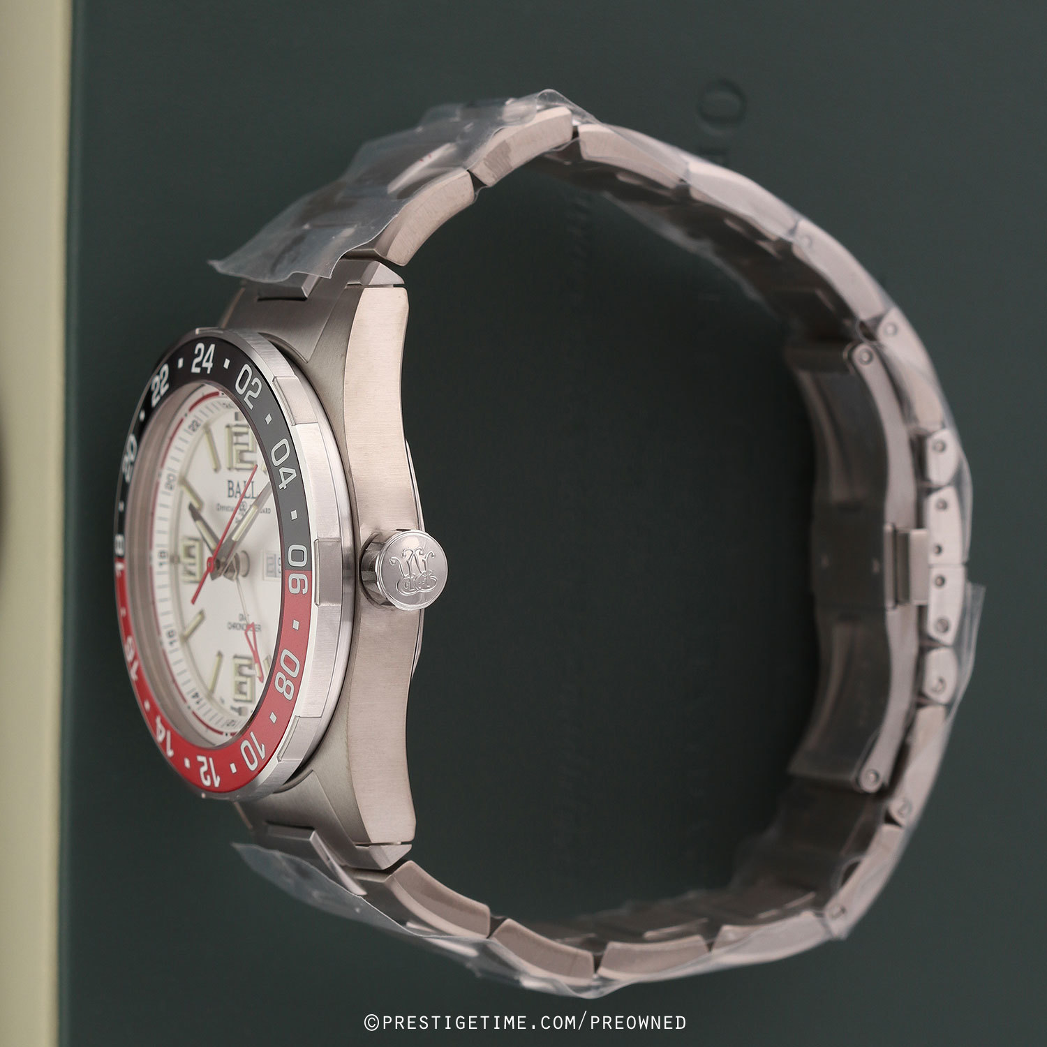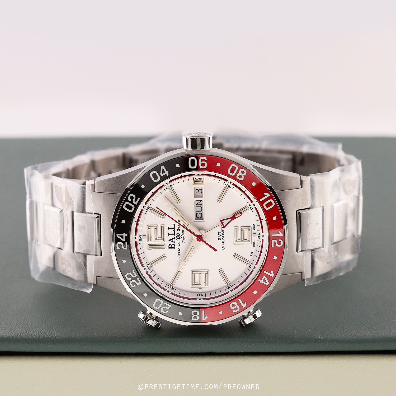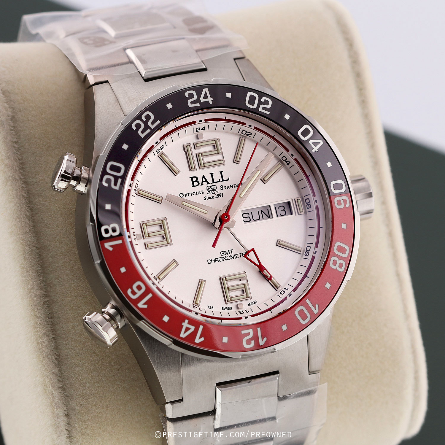 Case: Brushed titanium case. Stainless steel bi-directional bezel with polished red and black ceramic GMT bezel ring. White dial. Polished hands. Applied index & numeral hour markers. Fine printed minutes/seconds track. Day & date windows at 3 o'clock.