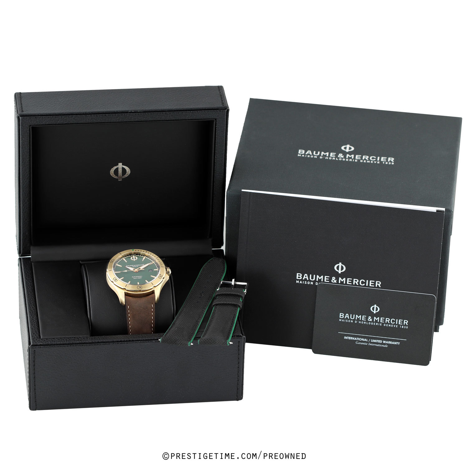 - An additional unworn black calfskin strap with green lining is included. This strap is completely new without any signs of wear at all.