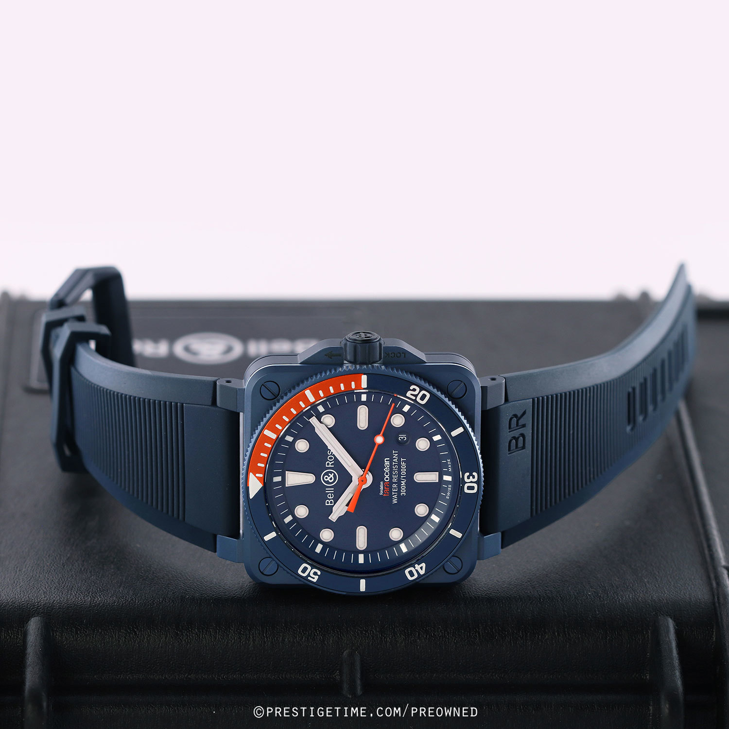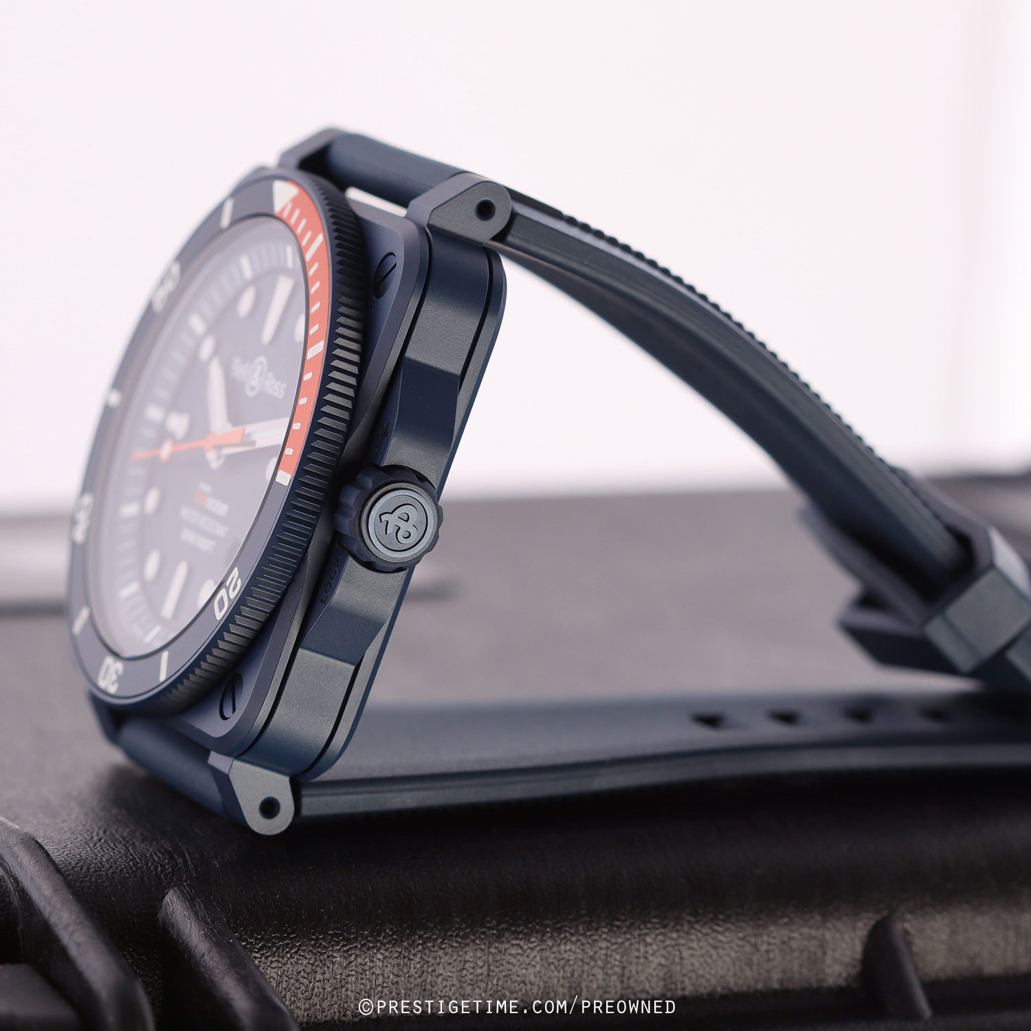 - Fitted on its original Bell & Ross blue rubber strap with a blue PVD coated stainless steel tang buckle. This strap is unworn in new condition with its full wear lifespan remaining.