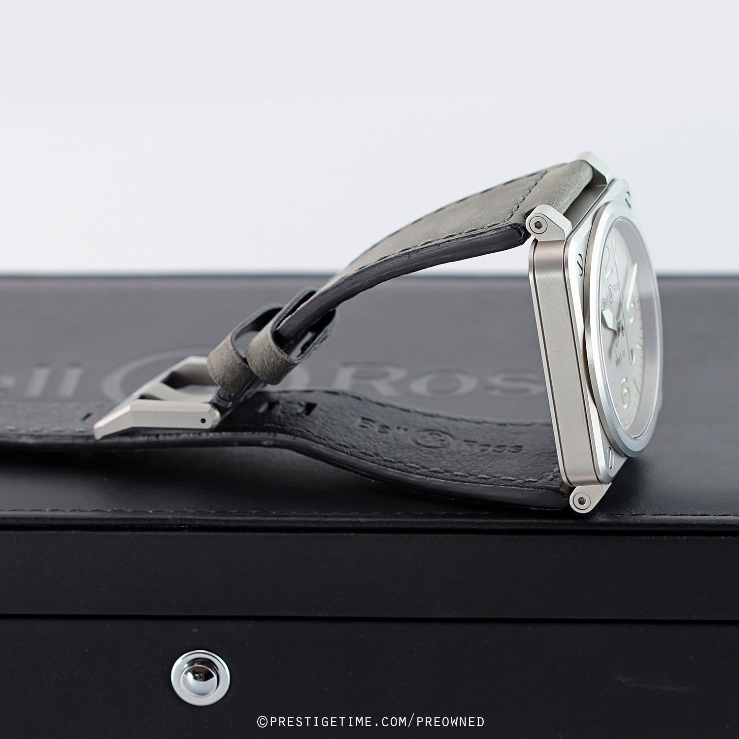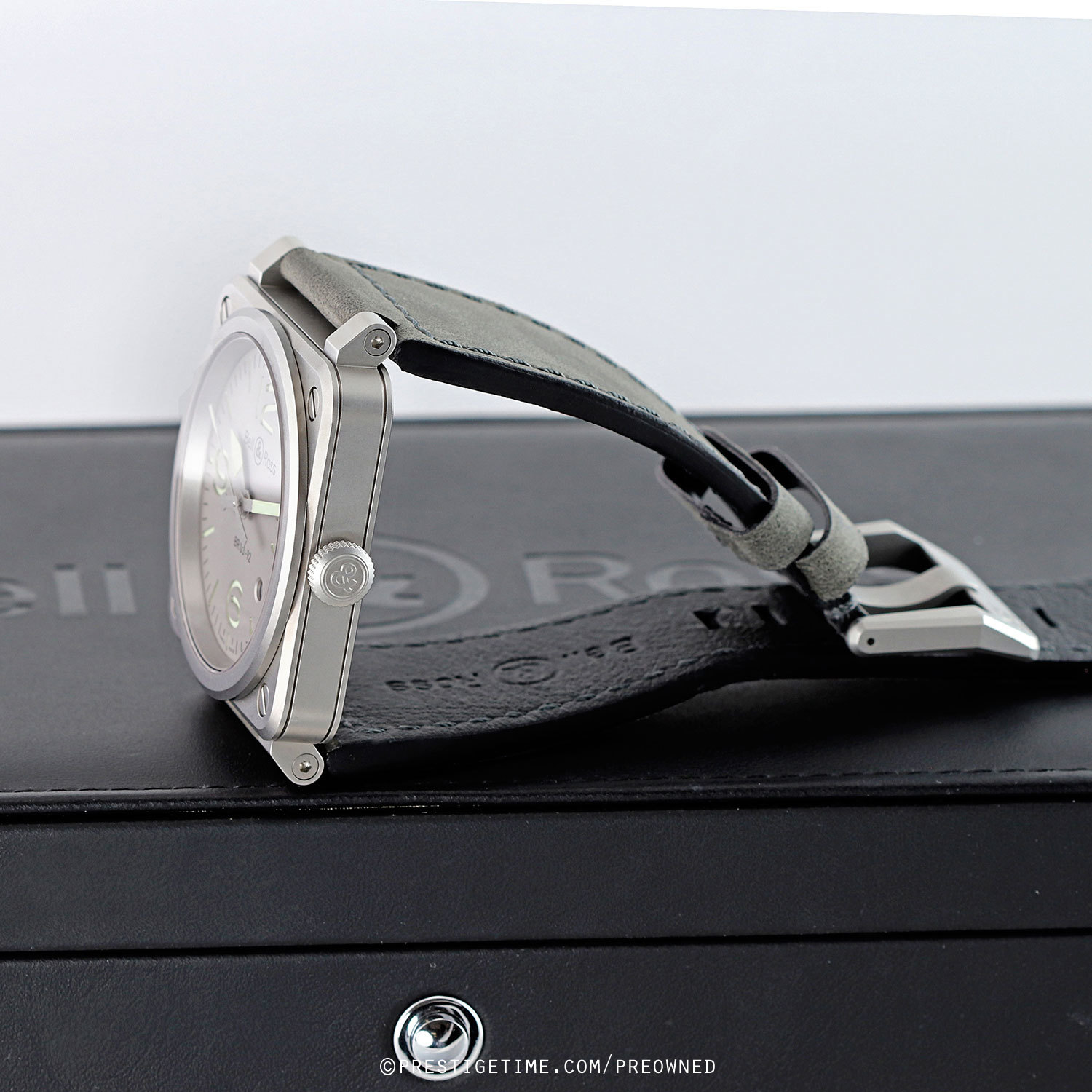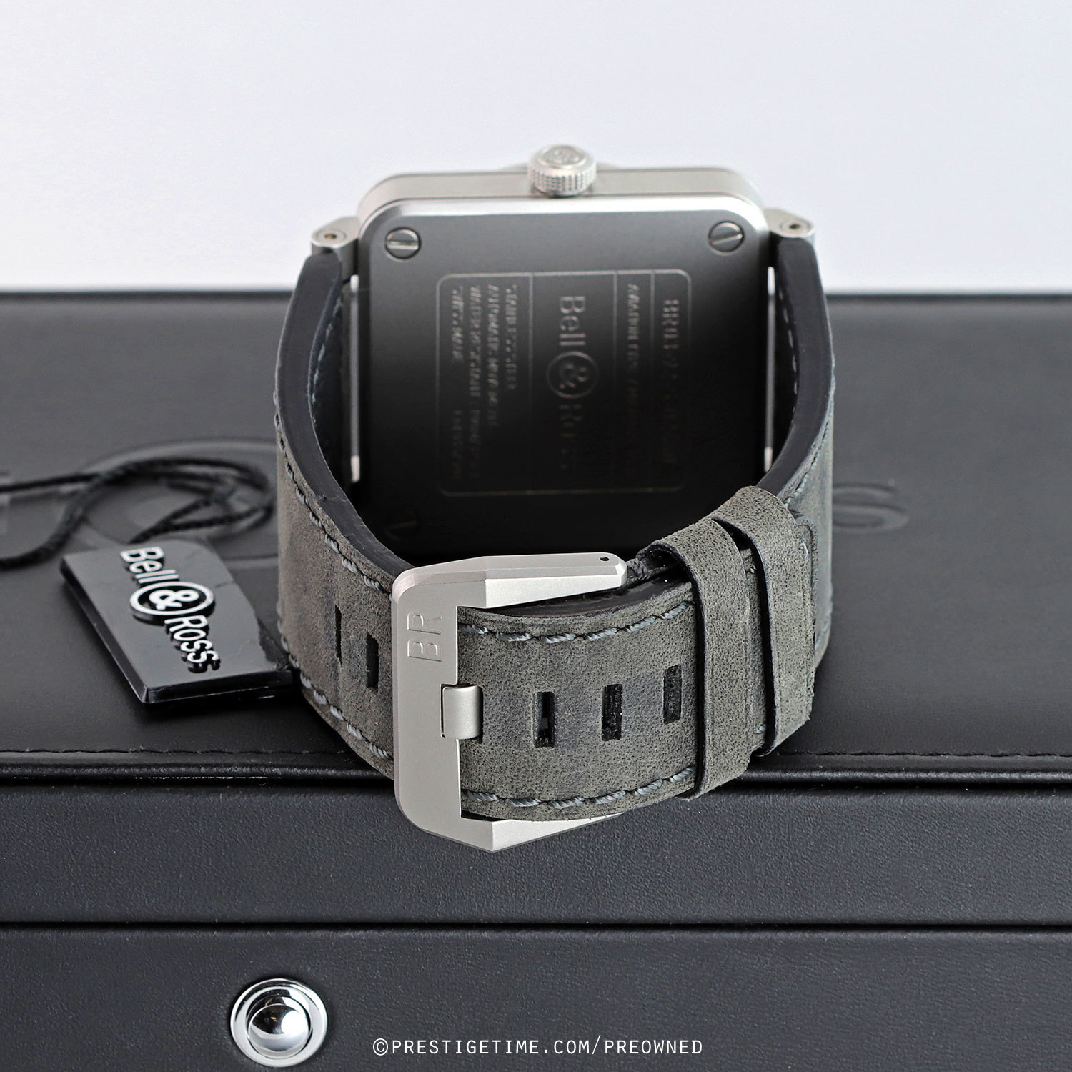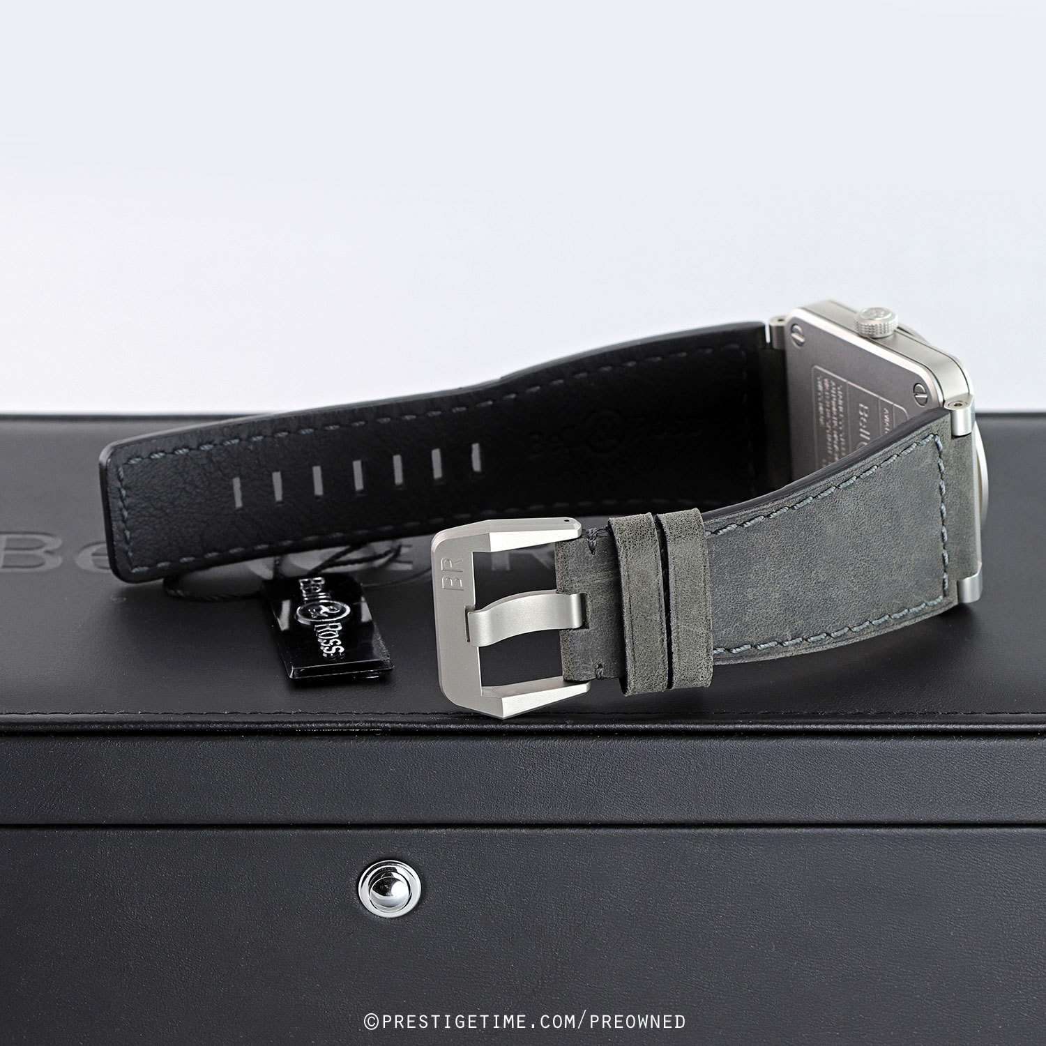 - Fitted on its original Bell & Ross grey raw-hide calfskin leather strap with a micro-blasted finished stainless steel tang buckle. This strap is in excellent, near new condition with the majority of its wear lifespan remaining. We would be comfortable rating the strap as in 95%+ condition.