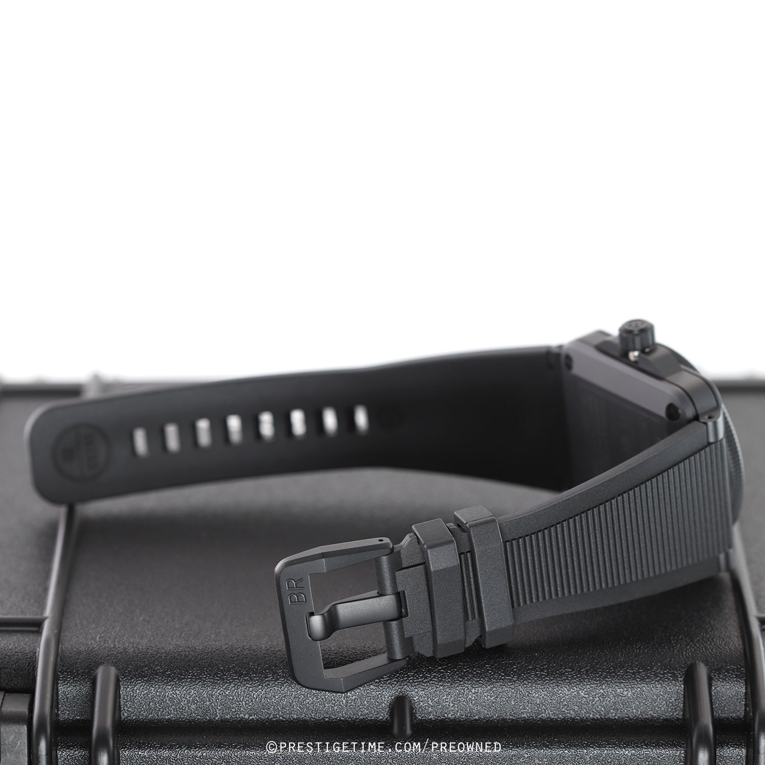 1. Fitted on its original Bell & Ross black rubber strap with a black PVD coated stainless steel tang buckle. This strap is unworn in new condition with its full wear lifespan remaining.