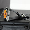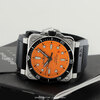 Case: Brushed stainless steel case with polished beveled corners. Black aluminum uni-directional diving bezel. Orange dial. Darkened hands with luminous fill. Applied darkened hour markers with luminous fill. Orange dial-flange with minute track. Date window between 4 & 5 o'clock.