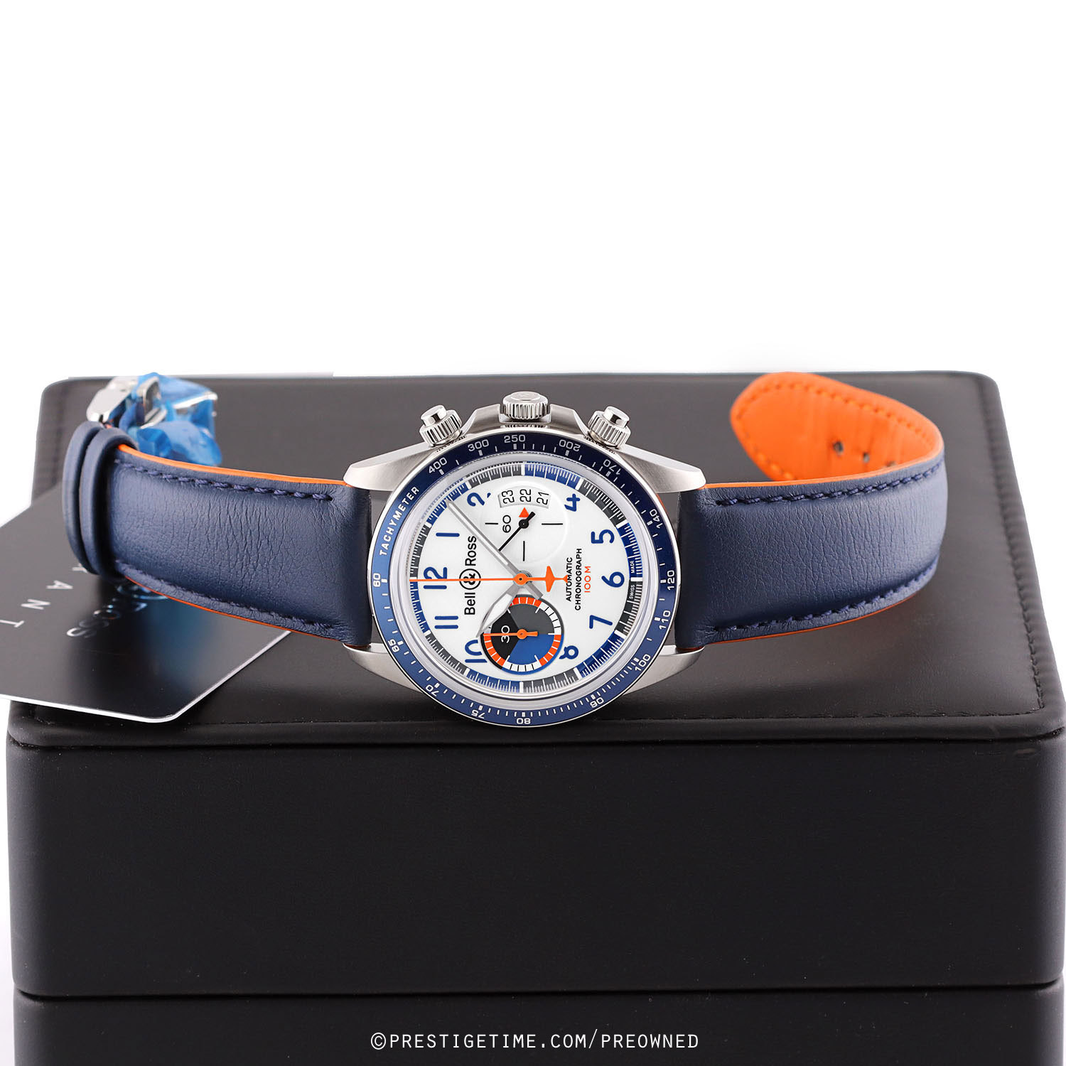 Strap: Fitted on its original Bell & Ross blue calfskin leather strap with orange lining & a stainless steel push-button deployant clasp. The strap is unworn, in new condition with its full wear lifespan remaining.