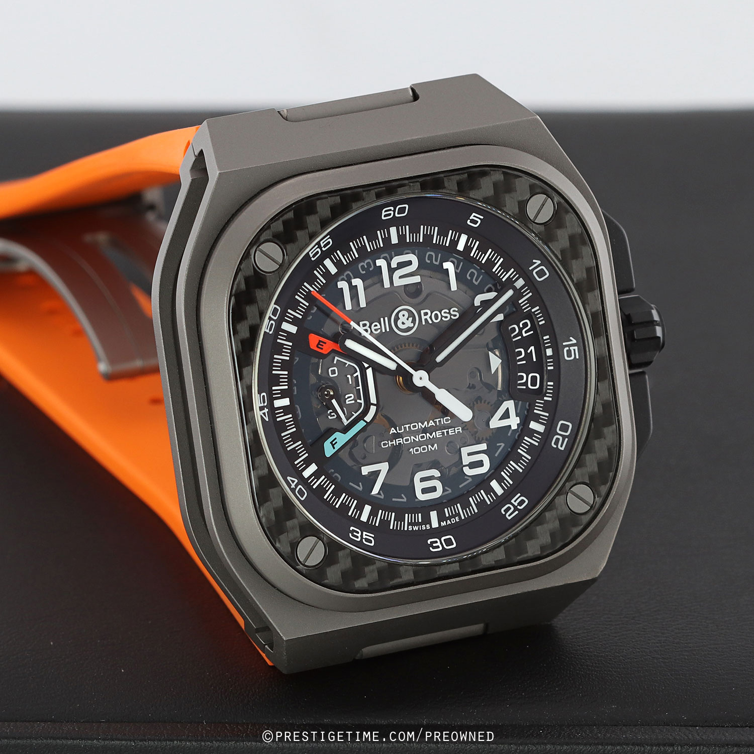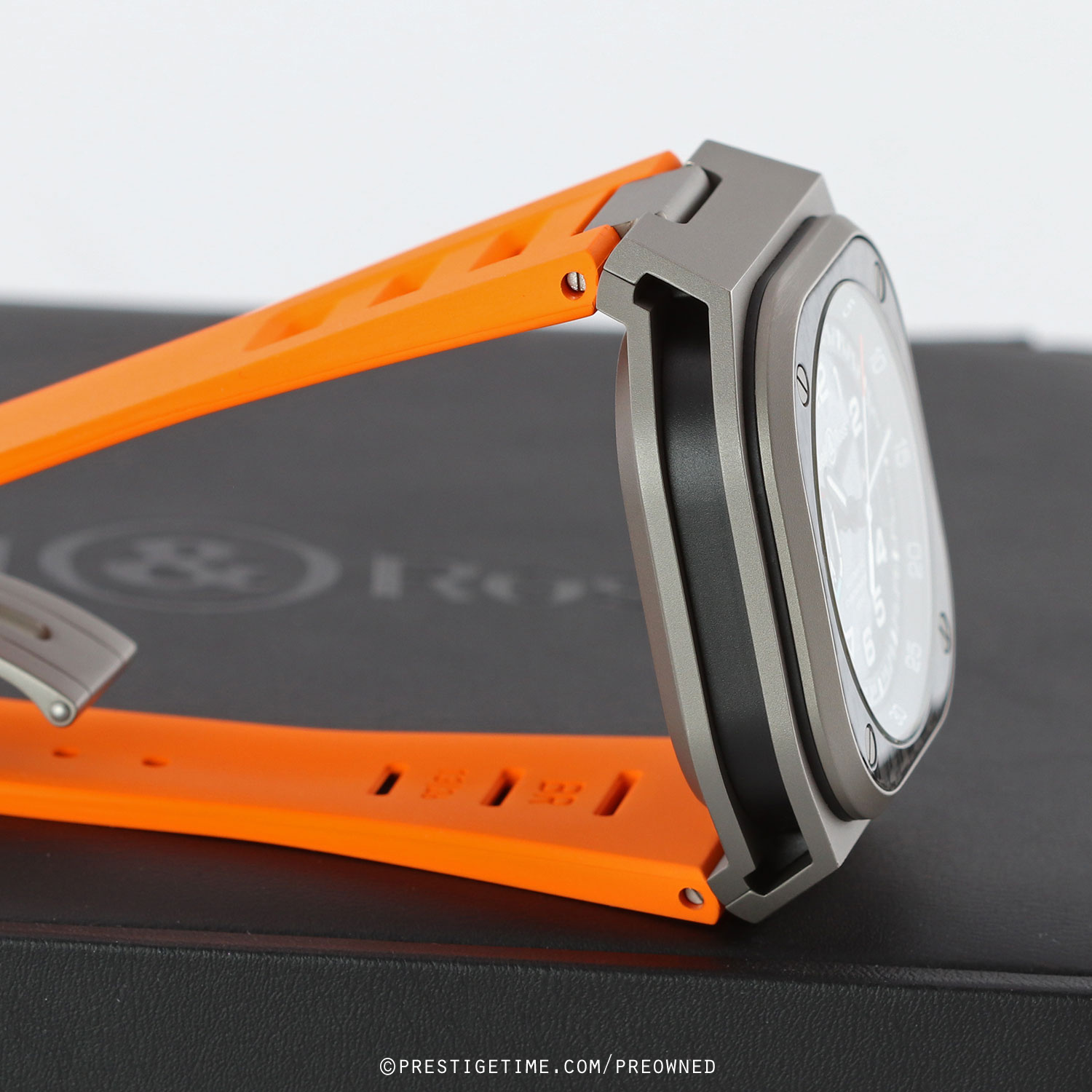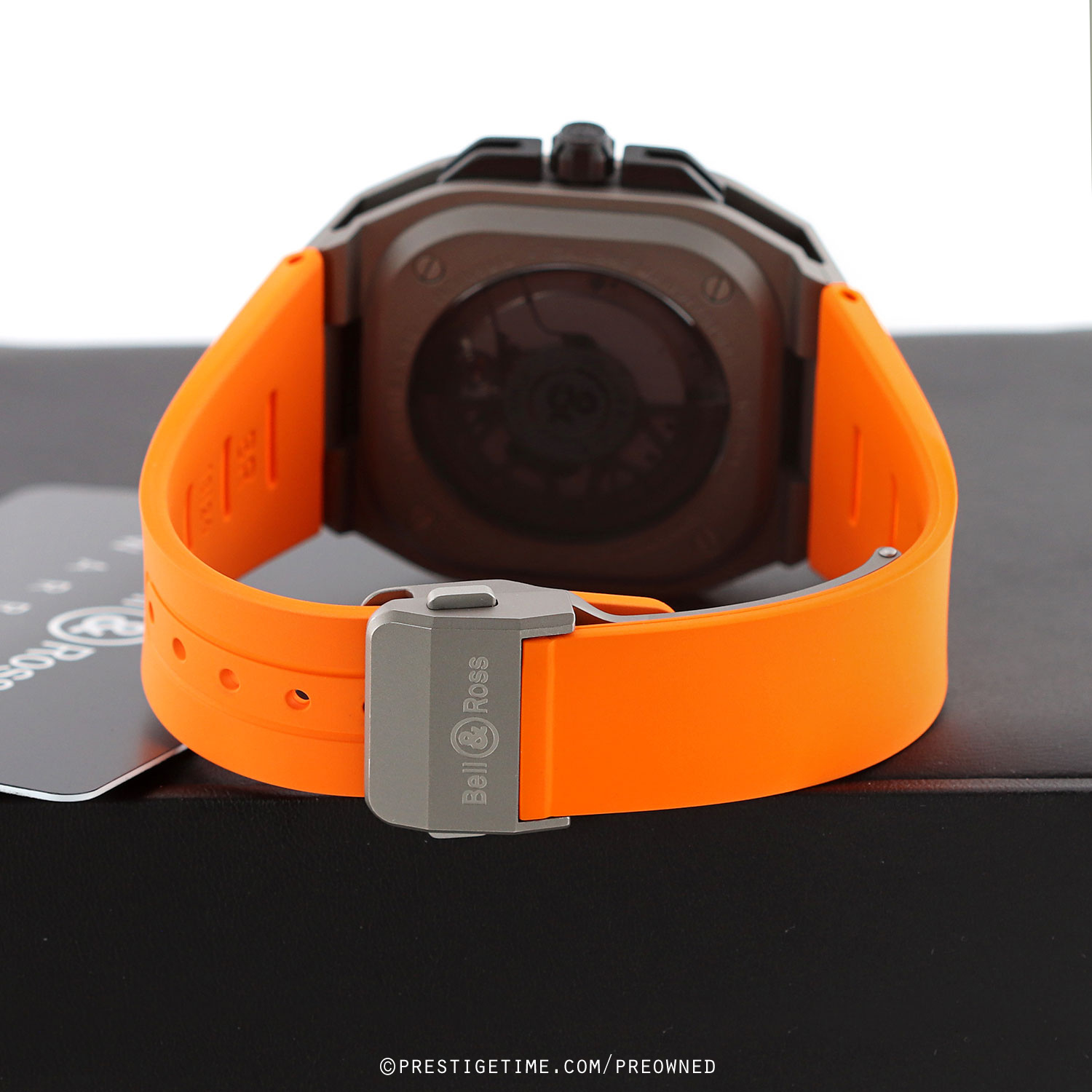 - Fitted on a Bell & Ross original orange rubber strap with a sandblasted finished titanium push-button deployant buckle. The strap is in near brand new condition, with its full wear lifespan remaining. We would be comfortable rating the strap as in 99% overall condition.