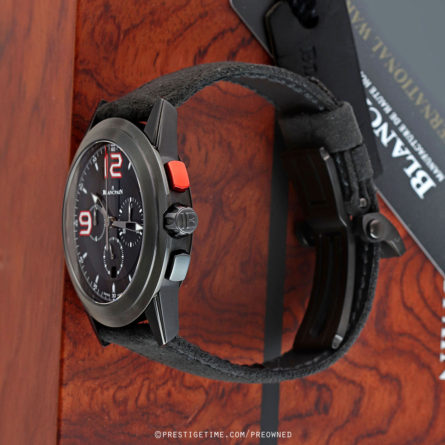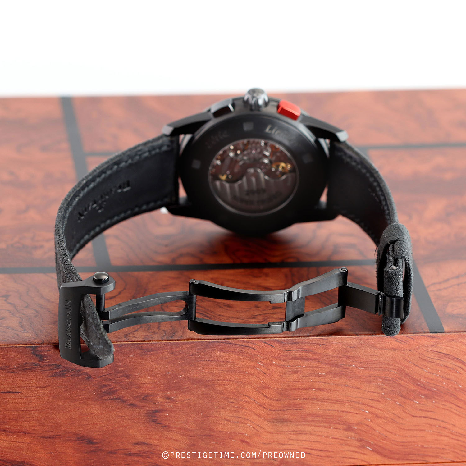 Strap: Fitted on its original Blancpain black velour raw-hide calfskin leather strap with a black PVD coated stainless steel deployant buckle. The strap is unworn in new condition with its full wear lifespan remaining.