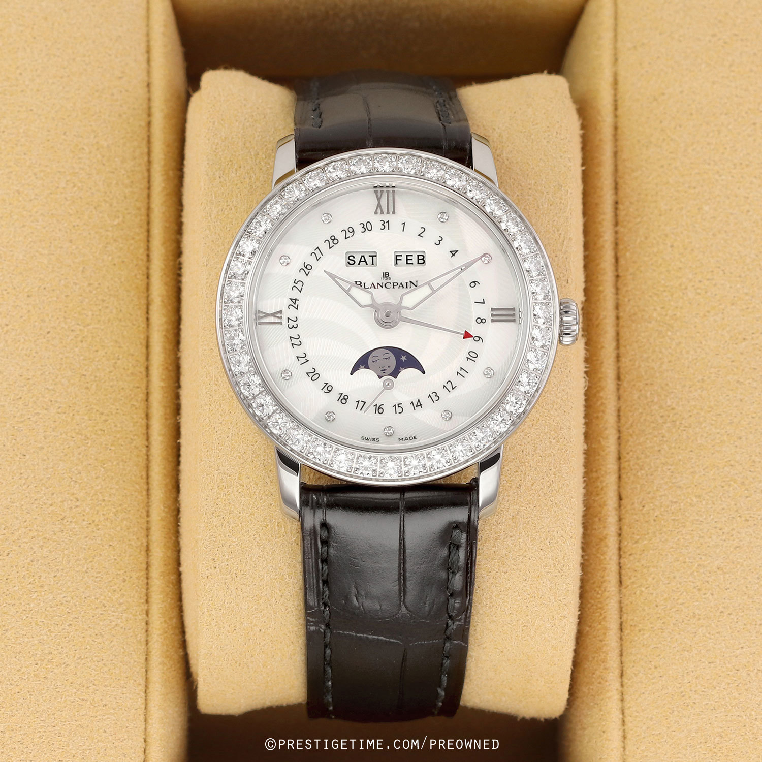 Case: Polished stainless steel case. Bezel factory set with 40 brilliant cut diamonds weighing a total of +/- 1.74 carats. Light mother of pearl guilloche dial with a radial sunburst patterned texture. Polished hands, the hour & minute hands with luminous fill. Hour markers: 9 diamond hour & applied polished 12/3/9 Roman numeral hour markers. Small seconds sub-dial at 6 'clock.